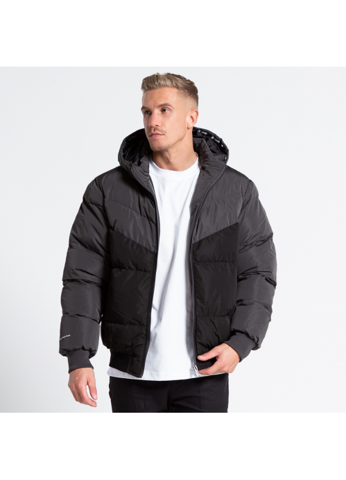 Hooded puffer jacket in black with charcoal upper panel, designed to keep you warm throughout the winter months. Featuring; Bee Inspired branded zip pulls, elasticated cuffs, and secure pocket design. Branded with our white linear Bee Inspired logo on the back and the wrist, as well as detailing inside the hood.